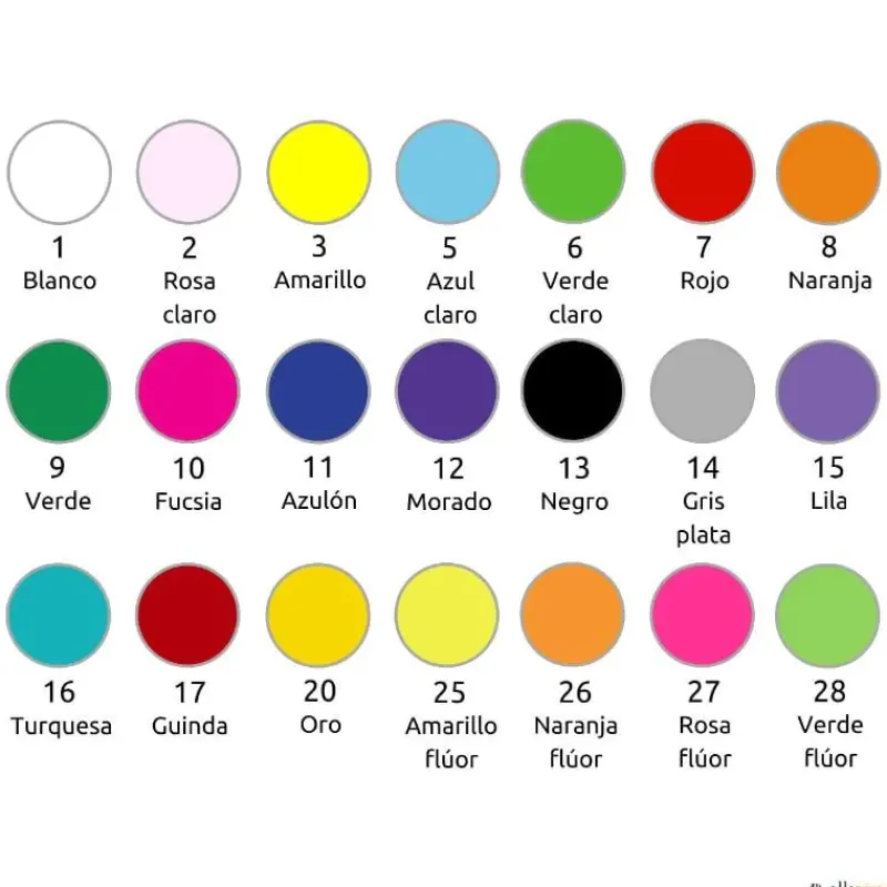 · 21 Colores: blanco (1) / rosa claro (2) / amarillo (3) / azul claro (5) / verde claro (6) / rojo (7) / naranja (8) / verde (9) / fucsia (10) / azulón (11) / morado (12) / negro (13) / gris plata (14) / lila (15) / turquesa (16) / guinda (17) / oro (20) / amarillo flúor (25) / naranja flúor (26) / rosa flúor (27) / verde flúor (28).