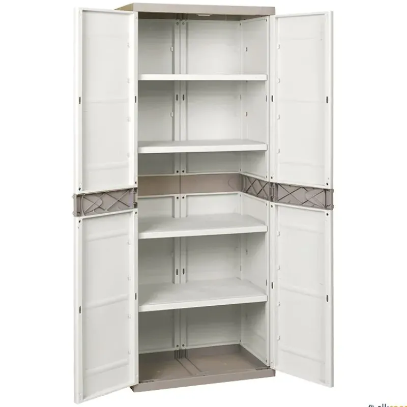 Armario fabricado en resinas plásticas de alta calidad. Robusto, resistente a ambientes húmedos. Montaje sencillo sin herramientas. Con posibilidad de cierre con candado (candado no incluido).