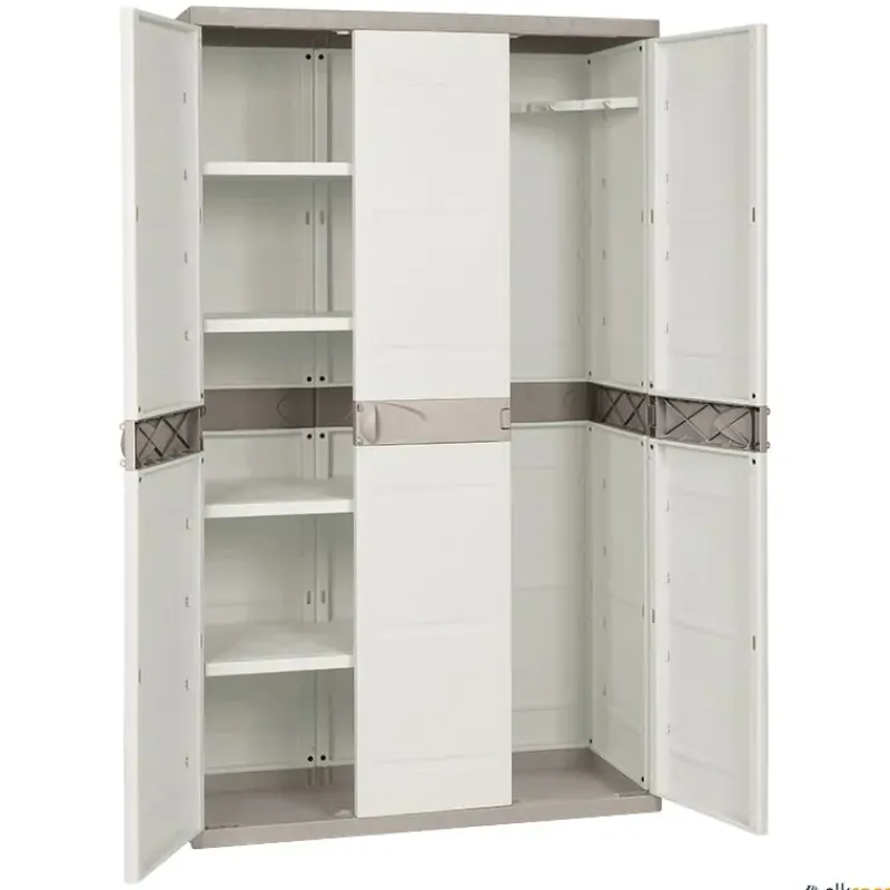 Armario de 3 puertas fabricado en resinas plásticas de alta calidad. Robusto, resistente a ambientes húmedos. Montaje sencillo sin herramientas. Con posibilidad de cierre con candado (candado no incluido).