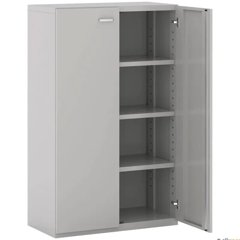 Armario metálico de 3 estantes fabricado en chapa de acero de 0,8 mm pulida y laminada en frío. Estructura monoblock soldada, pintada en epoxi en polvo y secado al horno. Armario dotado de niveladores y estantes regulables en altura. Las puertas están provistas de tiradores metálicos ergonómicos, acabados en aluminio, y bisagras con 110 grados de apertura. Cerradura de falleba con dos llaves de funda articulada.