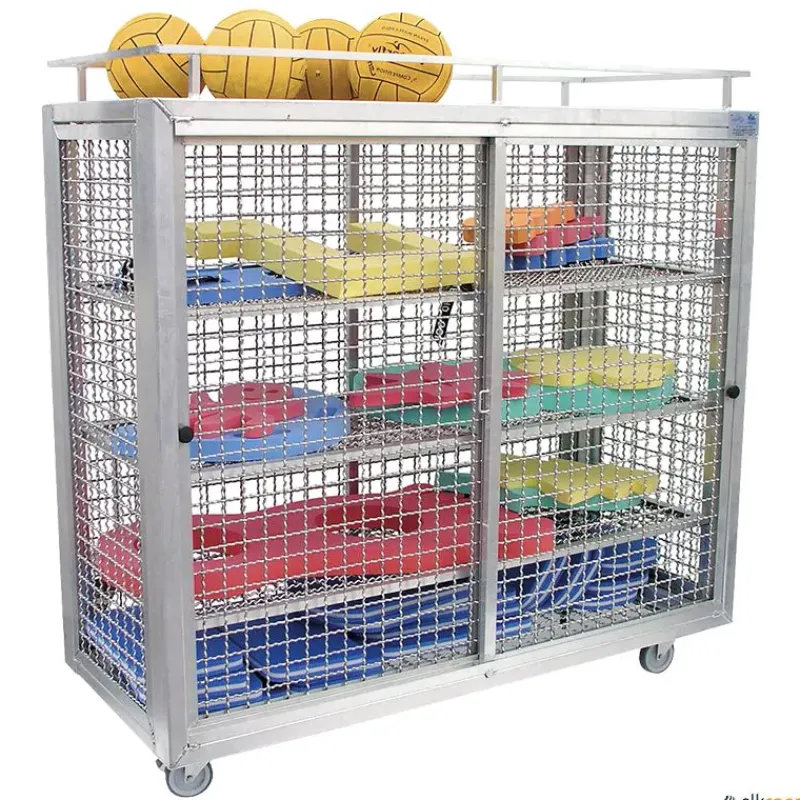 Armario para piscina fabricado en malla de aluminio con varilla de 5 mm de ø y cuadro de 50 x 50 mm. Con 2 puertas corredizas, 3 bandejas y compartimento en la parte superior para depositar más material. Incluye 4 ruedas giratorias en acero inoxidable.
