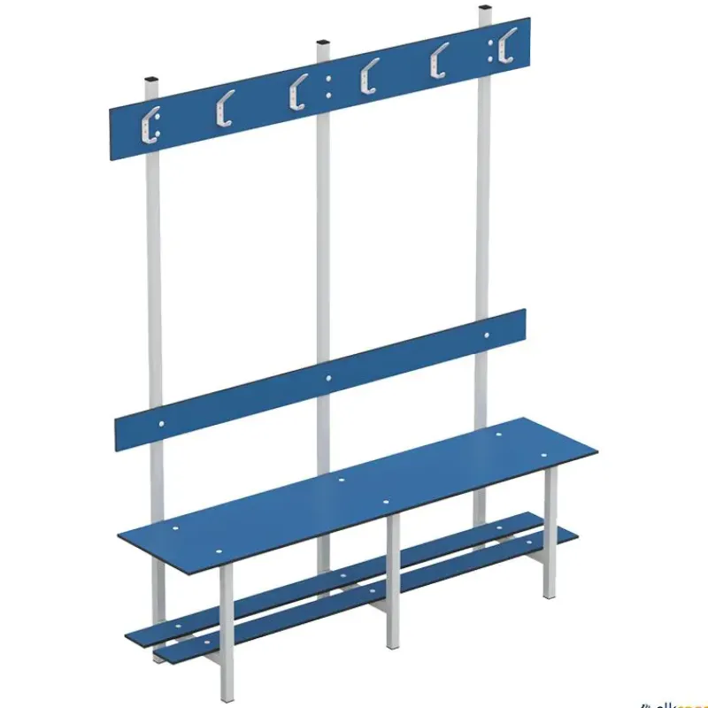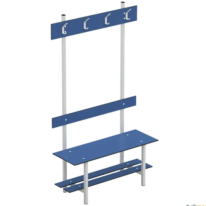 Banco fenólico con zapatero y perchero recomendado para piscinas y vestuarios. Material totalmente antihumedad. Durabilidad y robustez. Estructura soldada en acero inoxidable de tubo de 30 mm. Pintado epoxi. Tacos en PVC antideslizantes.