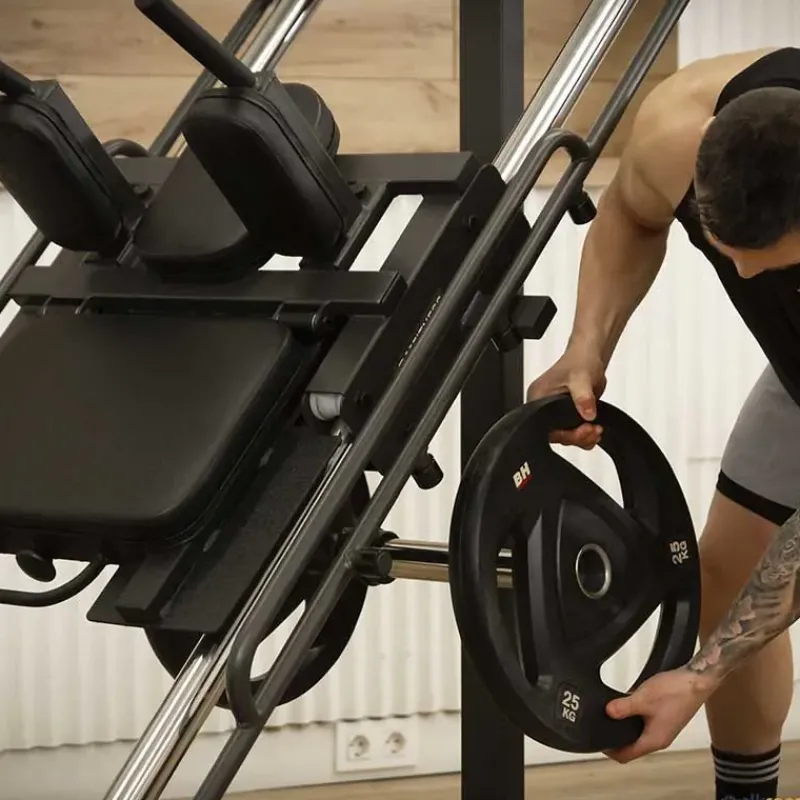 La estación de sentadillas y prensa de piernas de la marca BH es la mejor alternativa a las sentadillas para trabajar cuádriceps, isquiotibiales y glúteos de forma fácil y confortable para la espalda. La máquina de sentadillas y prensa de piernas BHFitness es perfecta para los entrenamientos de pierna más exigentes, muy populares entre los lifters y deportistas que realizan entrenamientos de fuerza y levantamiento de peso.
