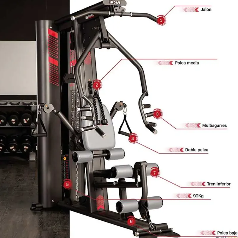 Cuenta con una carga máxima de 90 kg en todos los puestos, doble polea lateral, puesto de polea superior y rodillos para trabajar el tren inferior entre otras muchas características. Todo ello en una máquina con garantía Light Commercial perfecta tanto para usuarios avanzados como para pequeñas instalaciones de uso colectivo.