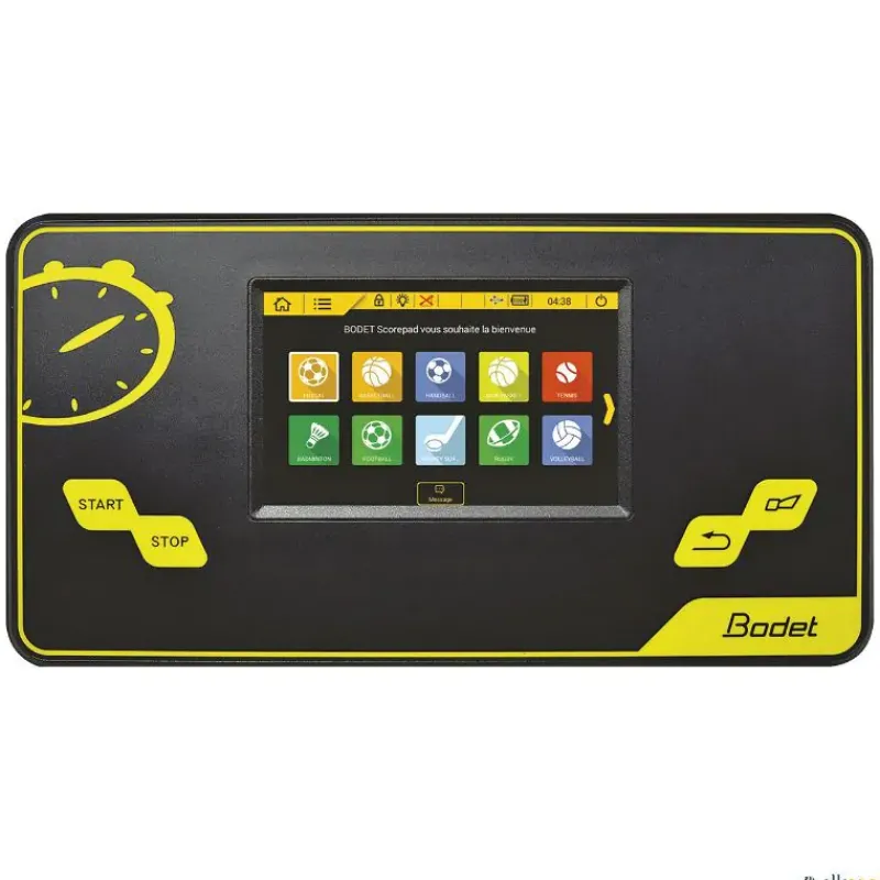 Pantalla táctil capacitiva de 7 pulgadas a color que permite controlar de forma sencilla marcadores, pantallas de video LED y televisiones LCD mediante conexión USB o HDMI. Scorepad Bodet tiene conexión a red eléctrica, y además está equipado con una batería de respaldo en caso de corte de suministro eléctrico con autonomía limitada a máximo 15 minutos. También puede conectarse de forma inalámbrica, sólo compatible con marcadores Bodet, a través de una batería interna (no incluida) con una autonomía de 4 horas.