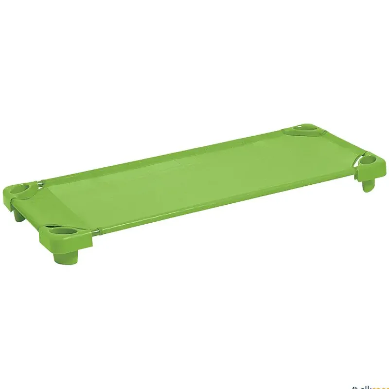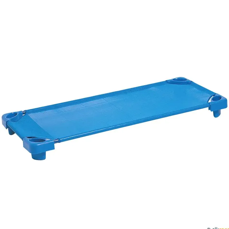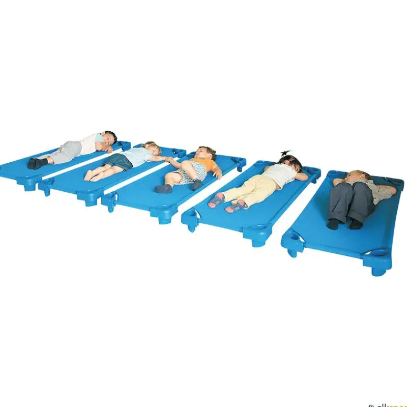 Lote de 5 camas para guardería fabricadas en hierro bañado en capa plástica. Esquinas fabricadas en polipropileno. Red de nailon protegido con capa termoplástica. Lavables con agua y jabón, es posible desinfectarlas con lejía. Apilables.