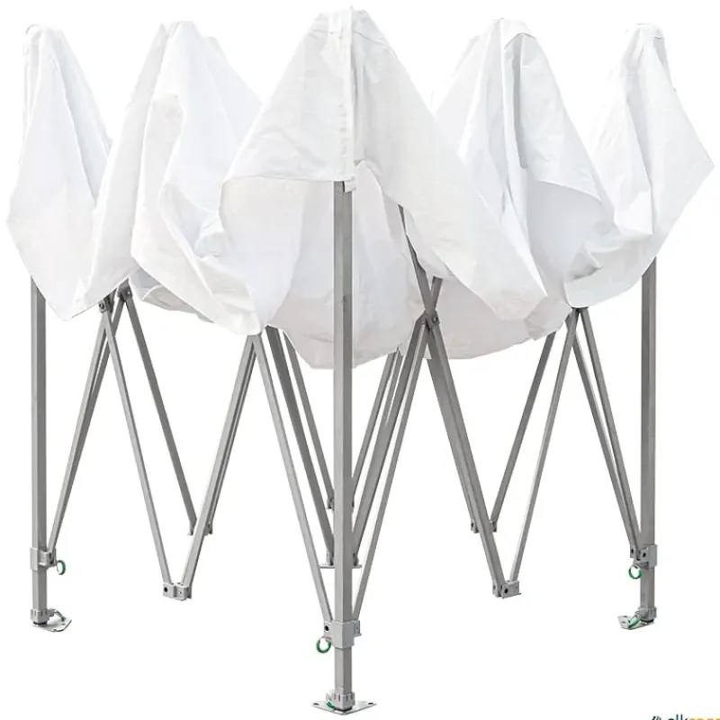 Carpa plegable de calidad profesional con estructura de acero lacado en blanco de 29 x 29 mm. Tejido ignífugo de poliéster 300 g/m² 100% impermeable. Incluye bolsa con ruedas para transporte, cuerdas y piquetas.
