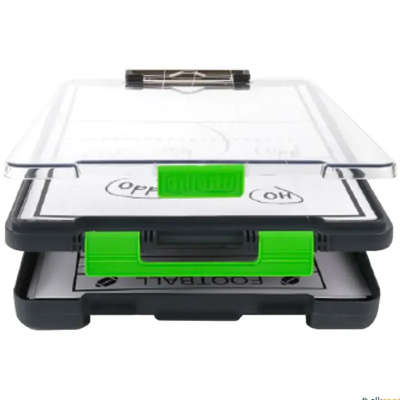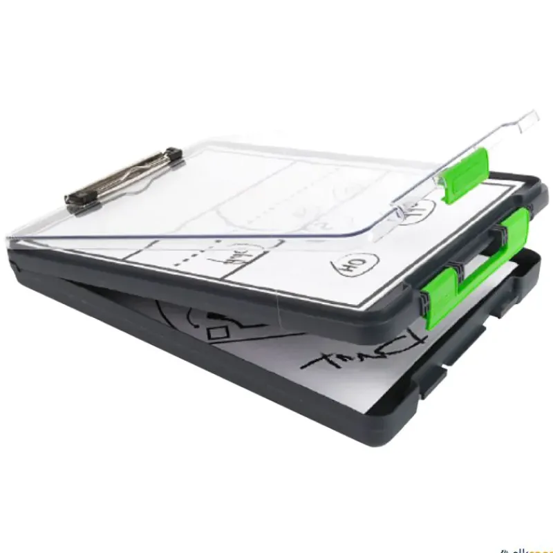 Carpeta de almacenaje rígida Pro está compuesta por 2 compartimentos independientes y clip metálico externo. Compartimento inferior de gran capacidad y compartimento superior con tapa transparente que contiene y protege los esquemas de los campos, las listas o los planes de entrenamiento, lo que permite que estén muy accesibles y sean fáciles de ver. Además, la tapa se puede utilizar para escribir con rotuladores de borrado en seco.