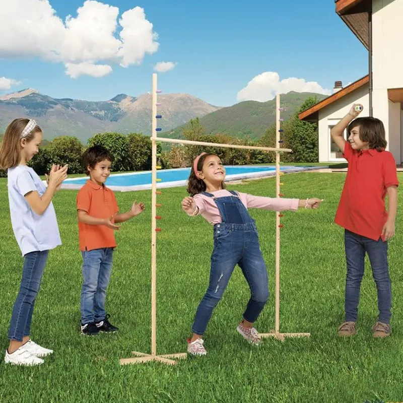 El juego de limbo es un juego tradicional que consiste en pasar por debajo de un palo que cada vez se sitúa a menor altura. Fabricado en madera. Incluye dado de colores de 3 cm de lado.