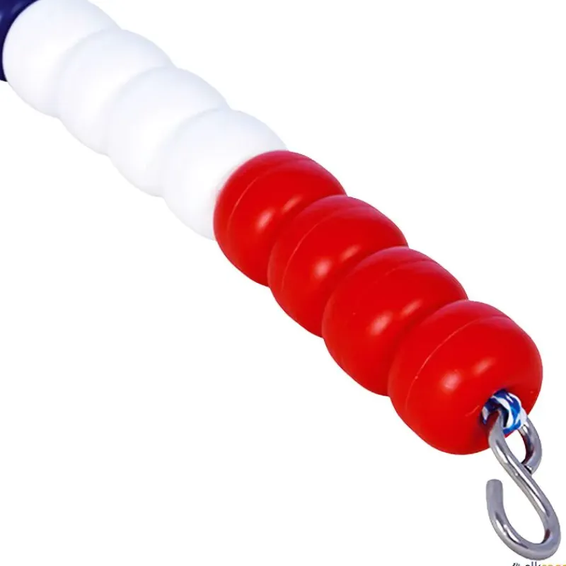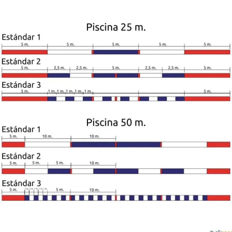 Corcheras para natación disponibles con cuerda de polietileno o cable de acero. En ambos casos se suministra con un gancho de sujeción en acero inoxidable ISI-316. Además, la corchera de medida 50 m. con cable de acero se suministra con un estabilizador de corchera.