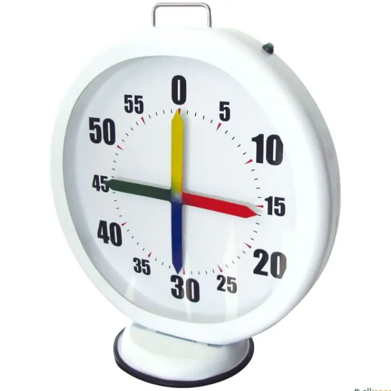 Cronómetro de entrenamiento portátil 4 agujas para piscina fabricado con protección frontal. Funciona con pilas. Agujas cruzadas de 4 colores diferentes.