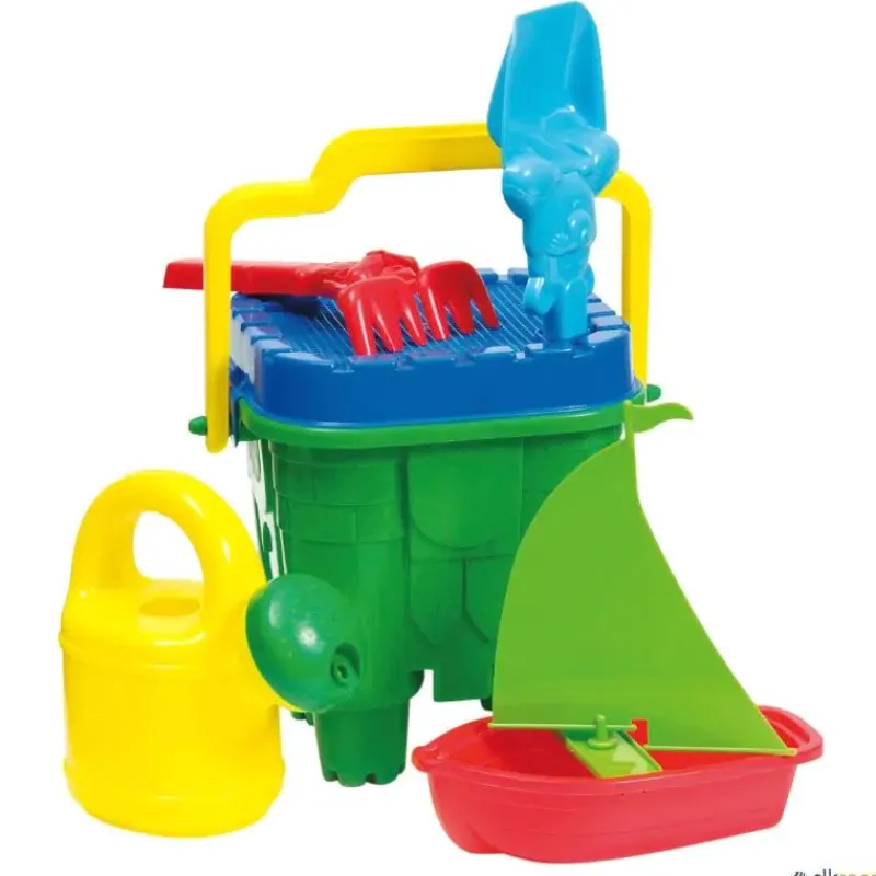 Cubo de playa de plástico para areneros, piscinas, etc. El cubo de playa incluye: cubo, cedazo, pala, rastrillo, regadera y barco.