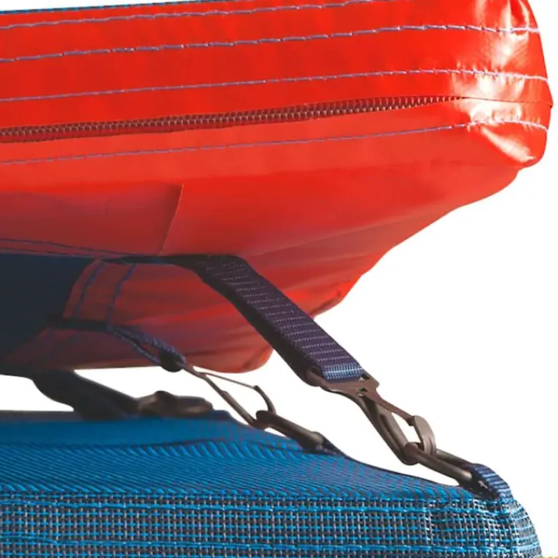 · Laterales y fondo recubiertos con tejido de PVC de 650 g/m², superficie y superposición del perímetro en tejido antipinchazos para una mejor evacuación del aire y un aterrizaje más cómodo. Banda de velcro blanca en la parte superior de la funda para indicar la línea cero. Zona de caída Dimasport fabricada en Francia.