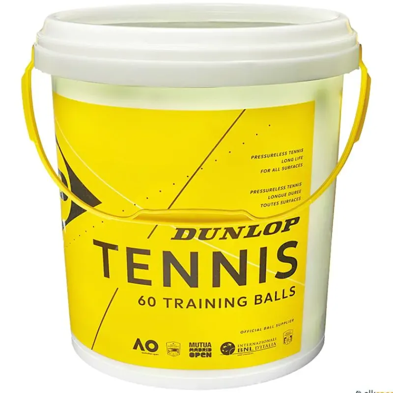Cubo con 60 pelotas de tenis Dunlop Training. Gracias a su fabricación con menor presión nunca se pinchan, pelota de tenis ideal para entrenamiento ya que garantiza un juego homogéneo y gran durabilidad.