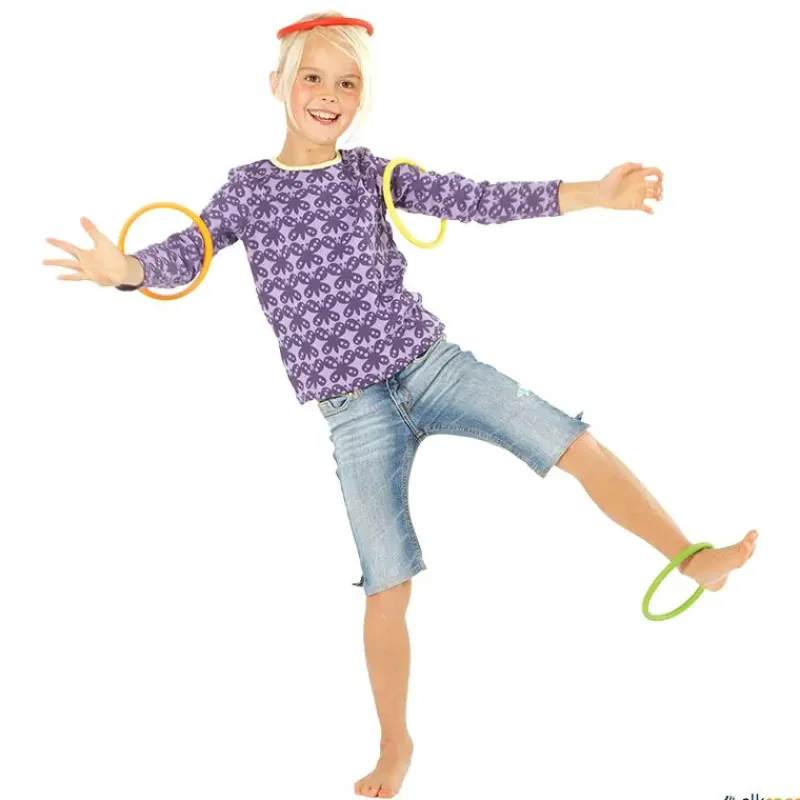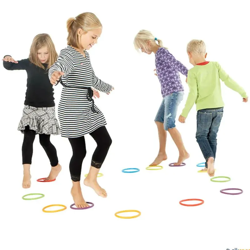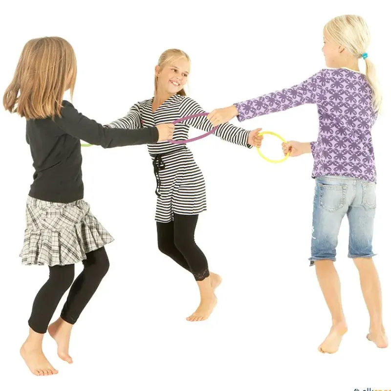 Las anillas de actividad son un conjunto de 6 anillas en 6 colores que atraen a niños de todas las edades, e incluso a adultos. Pueden usarse para infinidad de actividades como bailar en círculo, caminar pisando dentro de ellas con los dedos de los pies, caminar con ellas en la cabeza sin que se caigan, lanzarse anillas unos a otros, crear formas, es vuestra imaginación la que fija los límites.