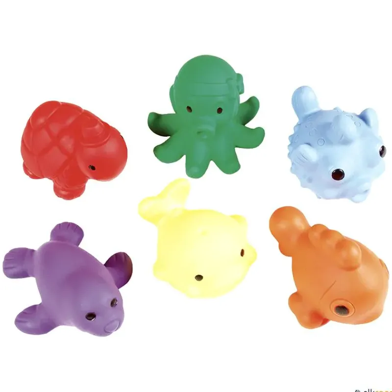 · Conjunto formado por 6 animales en 6 colores: ballena, foca, pez globo, pez payaso, pulpo y tortuga.