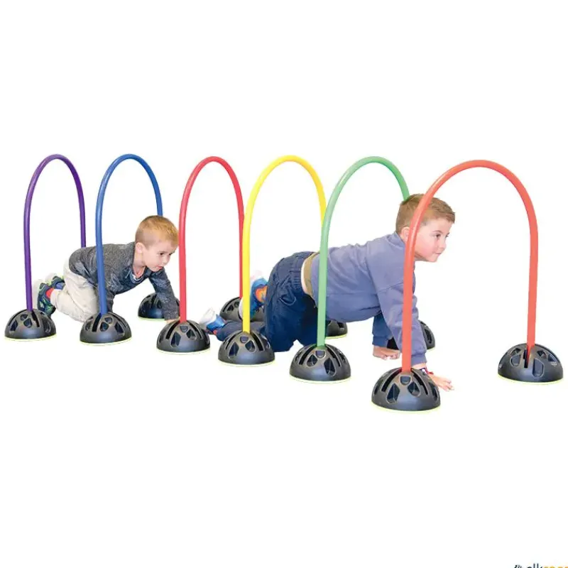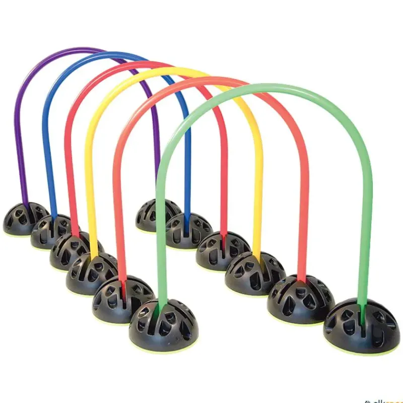Polivalente juego de arcos multiuso, no dejaras de crear actividades con ellos. Este conjunto de 6 arcos multiuso puede usarse para reptar o gatear, para lanzamientos de objetos o balones, con el pie o con la mano, tratando de mejorar las habilidades y destrezas básicas, como obstáculos para realizar recorridos de agilidad o plantear nuevos juegos. Los arcos están fabricados en plástico muy resistente y duradero, se estabilizan mediante unas bases de 390 g de peso situadas en las terminaciones de cada arco.