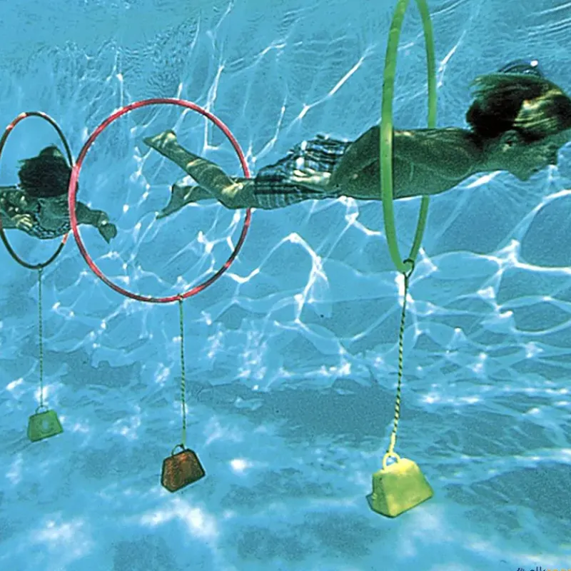 Aro con peso para divertirse debajo del agua. Mediante la regulación de la cuerda que une el aro y la bolsa con peso, se puede situar el aro a la profundidad que se quiera, manteniéndose estable.