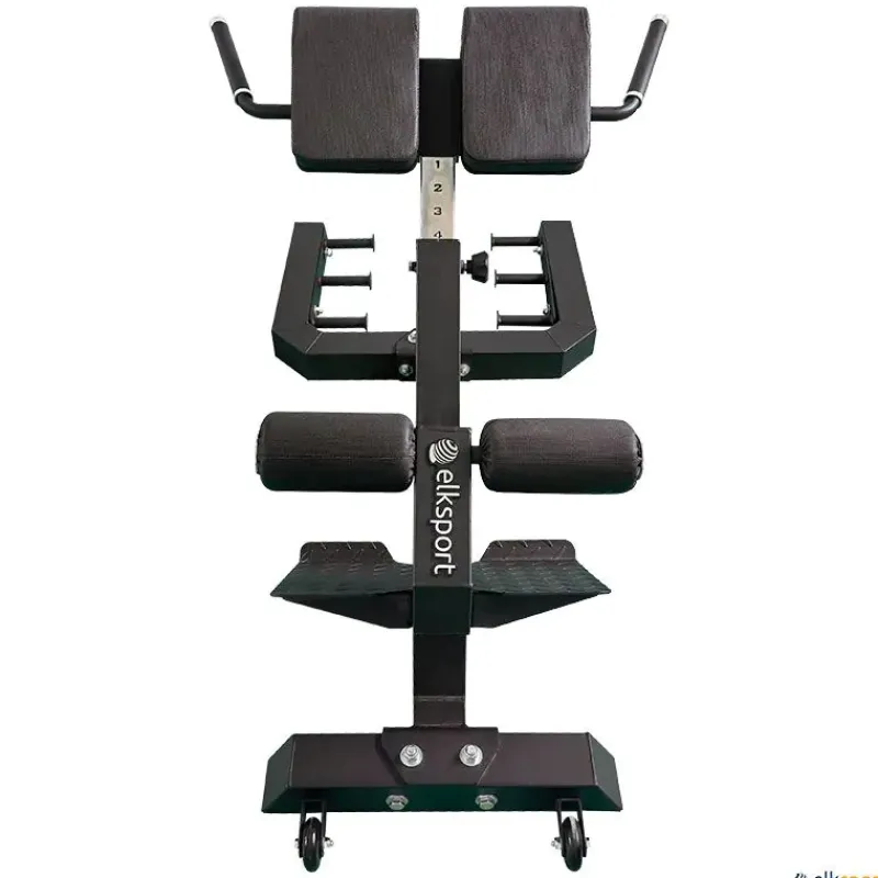 Banco de fitness multifuncional con un excelente diseño para entrenar la musculatura inferior de la espalda, glúteos e isquiotibiales realizando ejercicios de peso corporal. Su parte frontal lleva enganches laterales para poder utilizar bandas de resistencia y poder aumentar la intensidad de los ejercicios. Incluye ruedas para facilitar su transporte.