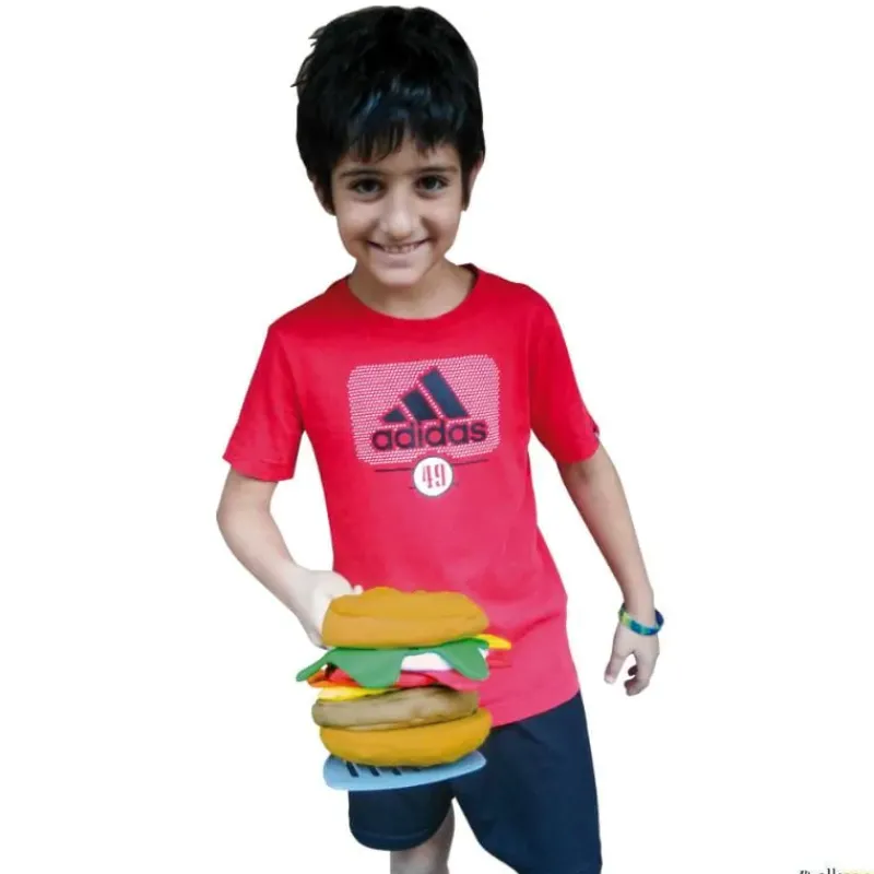 Los ingredientes de la hamburguesa se extenderán por el suelo, los alumnos deberán montarla, en su totalidad o parcialmente, y luego trasladarla con la espátula sin que se caiga hasta donde está el profesor o su compañero para hacer un relevo. Cuantos más ingredientes tenga la hamburguesa mayor inestabilidad, pero mayor puntuación. Se puede empezar trasladando hamburguesas básicas, para luego ir añadiendo el ingrediente acordado, en cada desplazamiento, hasta terminar los recorridos con la hamburguesa completa. Muchas posibilidades de actividades y de diversión. Cada juego incluye guía didáctica, además puedes consultar la guía didáctica en nuestro blog.