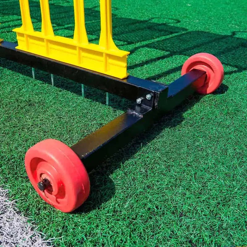 Carro para formar una barrera defensiva de 5 siluetas flexibles Evo, compuesto por un bastidor de acero de alta resistencia pintado al horno con ruedas delanteras para su desplazamiento.