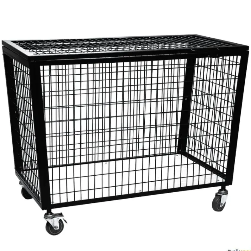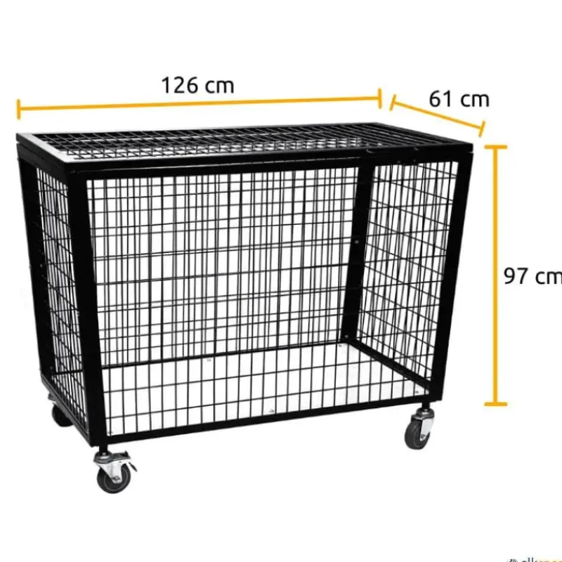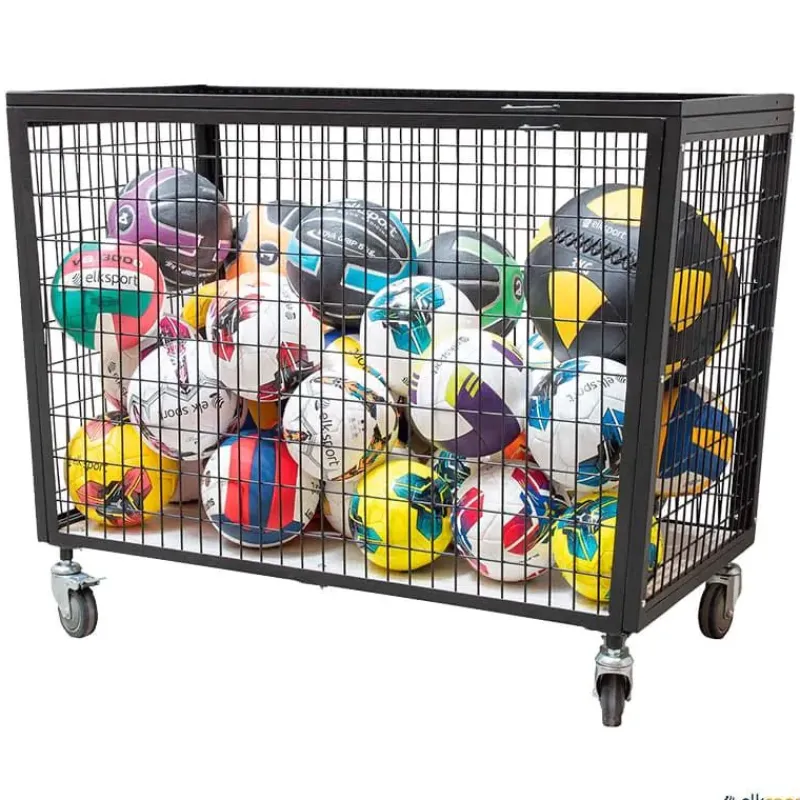 Carro fabricado con armazón de acero y malla soldada de 50 x 50 mm. Con un grosor de 5 mm. Dispone de 4 ruedas giratorias de 6 cm de diámetro, dos de ellas con freno. Sistema superior de apertura con bisagra soldada a la estructura, para facilitar la entrada y recogida de balones y sistema de cierre por candado (candado no incluido). Se suministra desmontado.