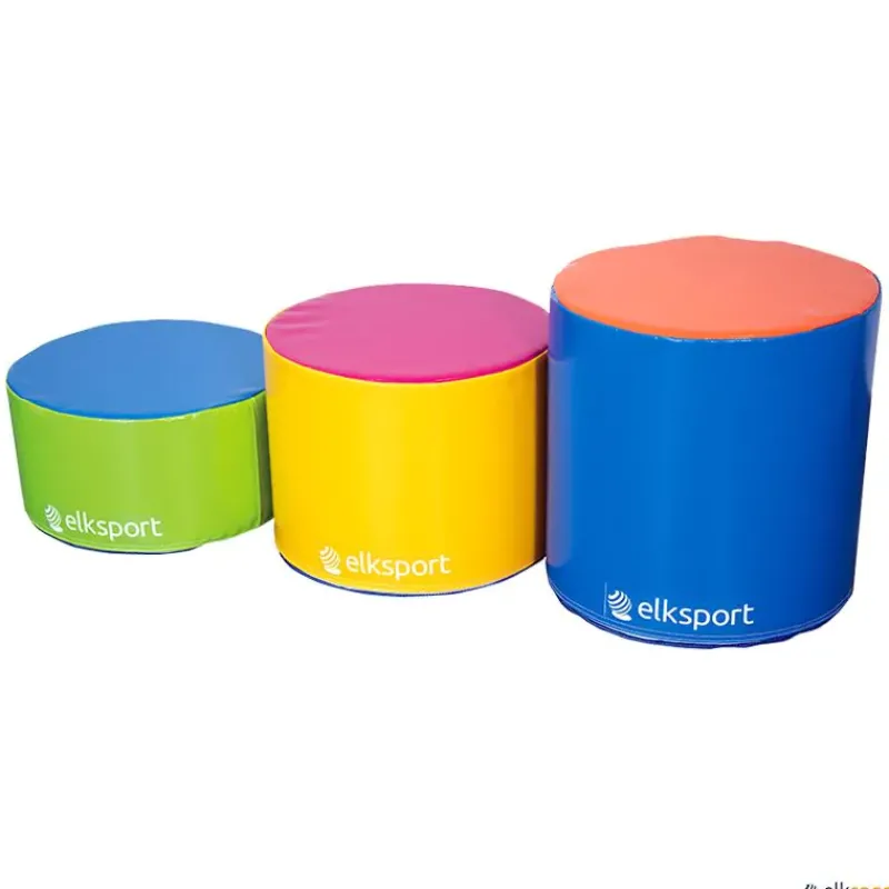 Conjunto de 3 cilindros en progresión de altura de espuma forrada cosida y con base antideslizante. Fabricados en material ignífugo con clasificación M2.