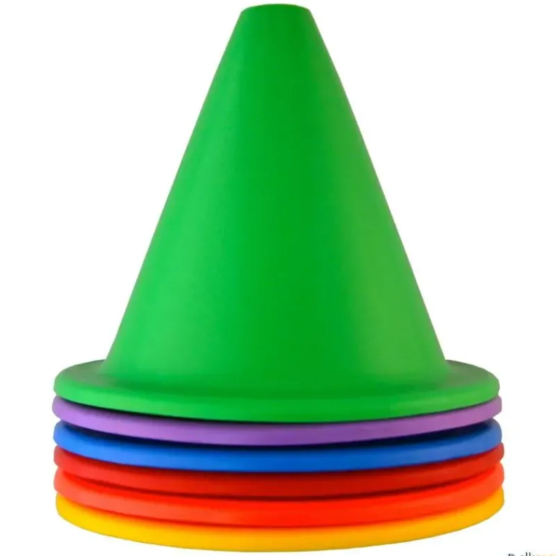 Disponibles en unidades o conjuntos de 6 conos en 6 colores (amarillo, azul, naranja, rojo, verde y violeta) a un precio más económico.