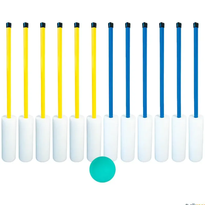 · Juego formado por: 12 mazas con base flexible (6 amarillas y 6 azules) y 1 pelota de espuma.
