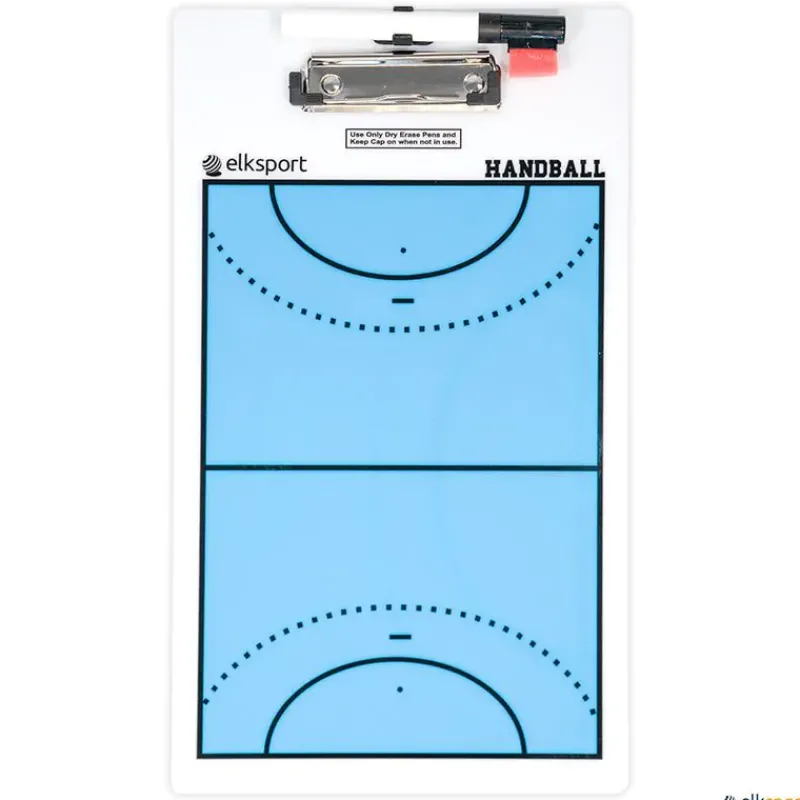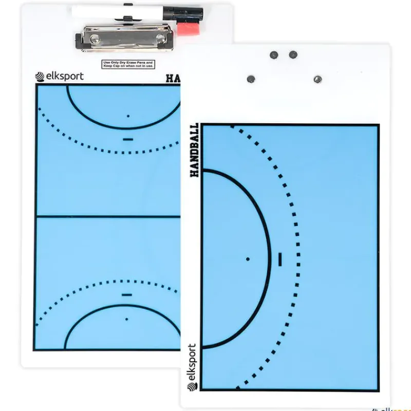 Pizarra rígida táctica para balonmano y fútbol sala, se puede usar por ambas caras: campo completo y medio campo. Incluye un rotulador de tinta borrable.