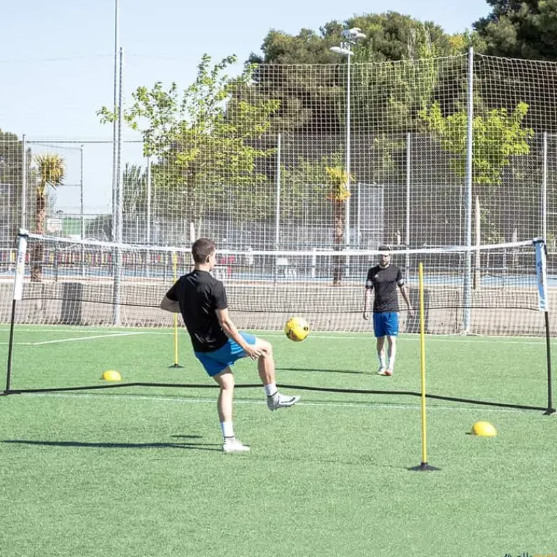 Red portátil fabricada con una estructura de acero que le aporta mayor rigidez con un número menor de piezas. Cuenta con un sistema que le permite ser regulable en altura (86,4 m ó 1,5 m ó 1,8 m) y regulable en longitud (3 m ó 6 m). Se monta en unos minutos y mantiene la red perfectamente tensa en todas las alturas. Dos usuarios pueden fácilmente desplazarla montada donde se necesite o desmontarla cuando acabe la actividad. Incluye 2 redes de gran calidad (3 m y 6 m) y una bolsa para transportar todo el sistema.