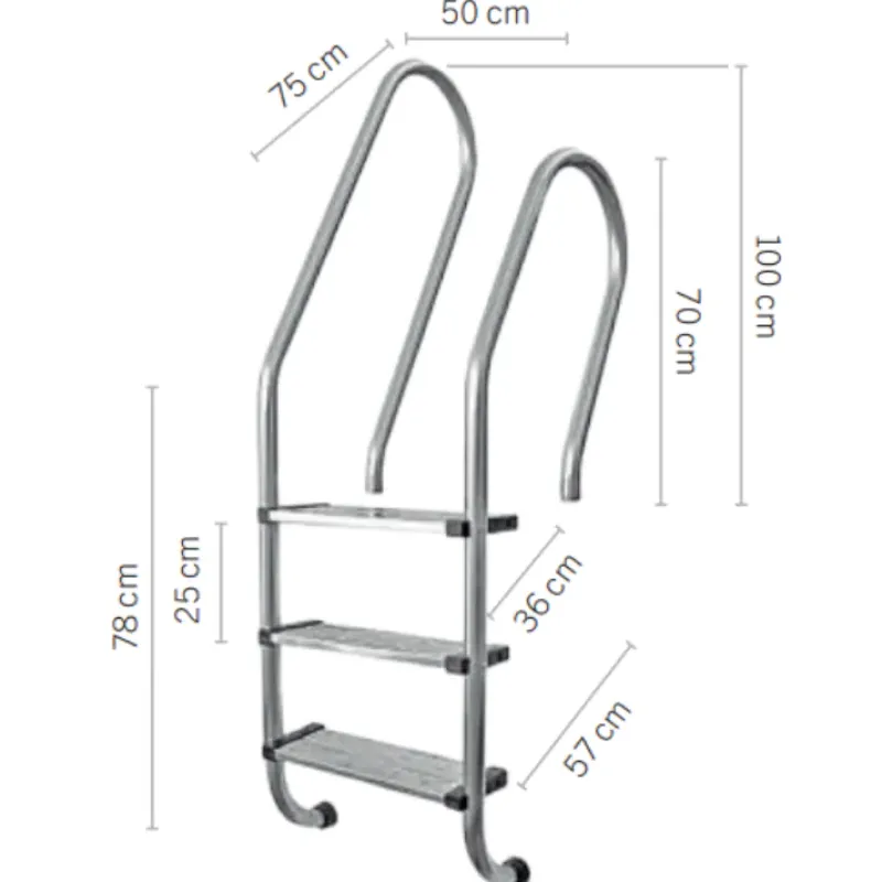 Fabricada en tubo de acero inoxidable galvanizado de 43 mm (AISI-316). Peldaño de acero inoxidable, con plástico antideslizante.