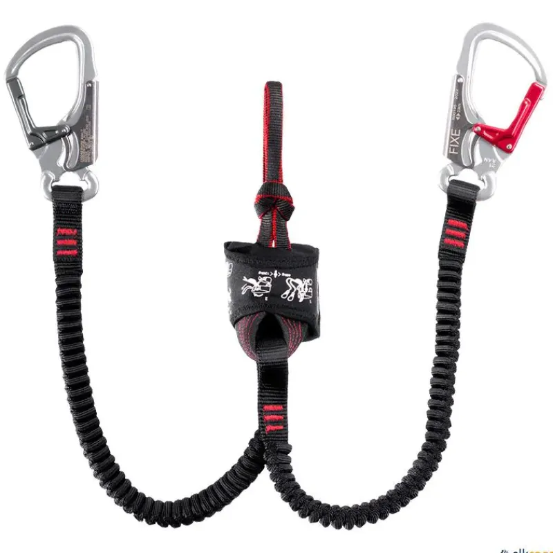 Sus brazos elásticos de poliéster ofrecen gran alcance (de 75 cm a 128 cm), y los mosquetones asimétricos de aluminio con sistema de doble desbloqueo garantizan una sujeción segura y rápida. El código de colores facilita la orientación durante el uso, especialmente útil en situaciones exigentes.