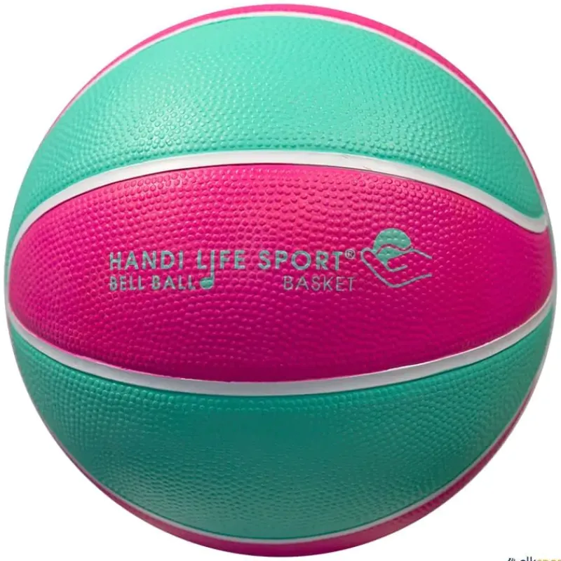 Balón de microbasket para invidentes, fabricado en goma rosa y turquesa con cascabeles en su interior que suenan cuando se mueve.