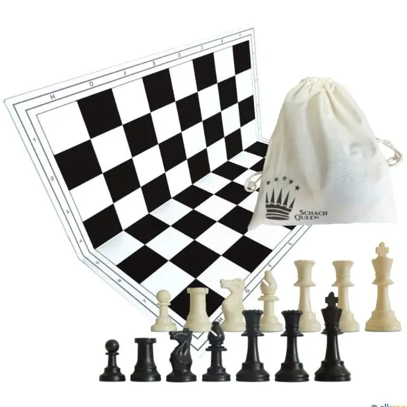 Juego de ajedrez formado por tablero plegable muy resistente, piezas de plástico y bolsa de algodón.