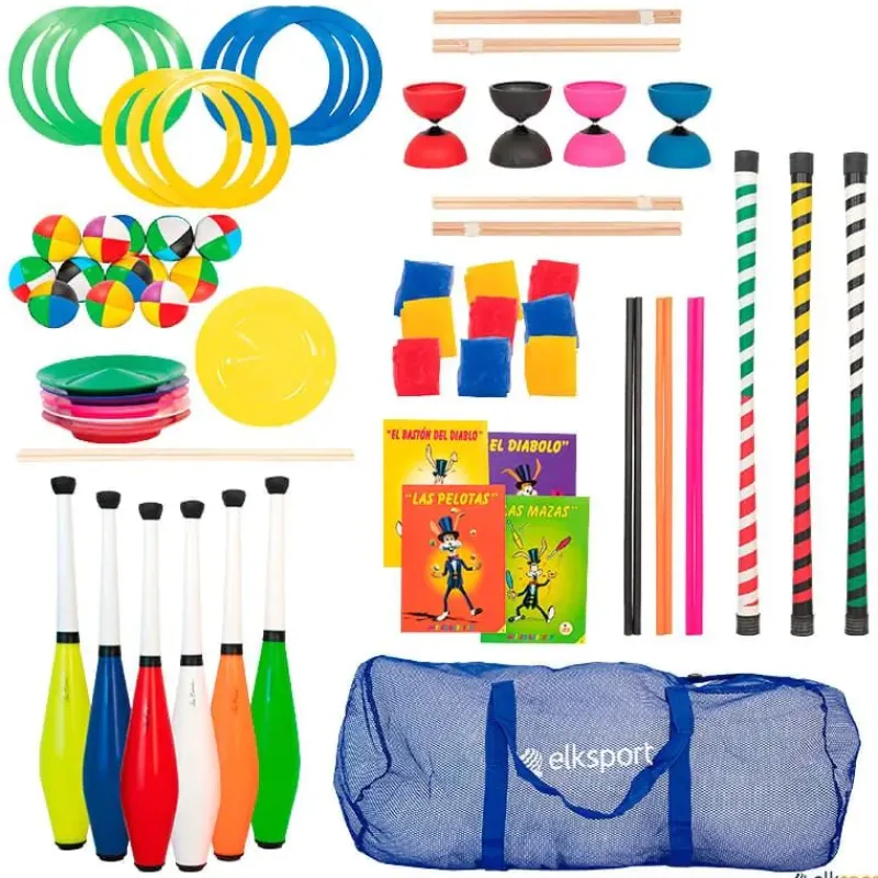 Para iniciación y perfeccionamiento de malabares, hasta 25 alumnos pueden realizar ejercicios simultáneamente. El lote malabares circo lo forman: