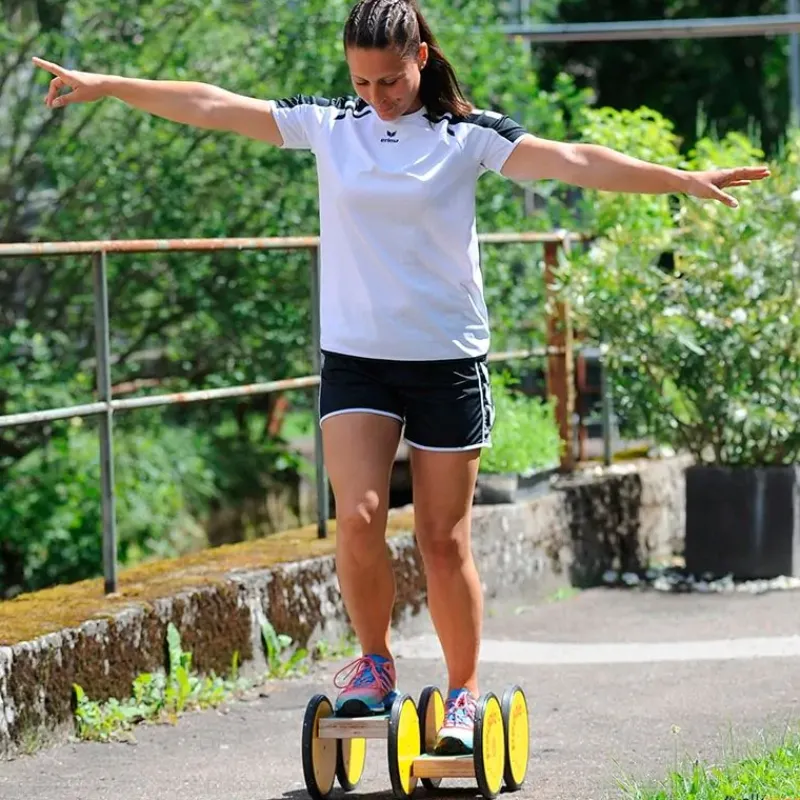 El peso corporal se desplaza de forma fluida entre ambas piernas y debe dosificarse la fuerza ejercida para mantenerse sobre el Pedalo. El equilibrio, la conciencia corporal y la seguridad del movimiento se mejoran cada vez más.