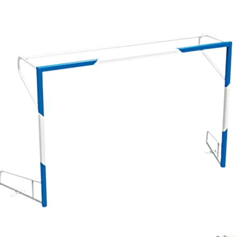 Portería oficial de fútbol sala fabricada con arquillos abatibles y marco de aluminio de 80 x 80 mm reforzado interiormente. Perfil desarrollado especialmente para porterías de fútbol sala. Sujeción a red anti atrapamiento. El pintado del marco se realiza con pintura en polvo poliéster en horno a alta temperatura y colores según normativa para competición. Sistema de fijación al suelo.
