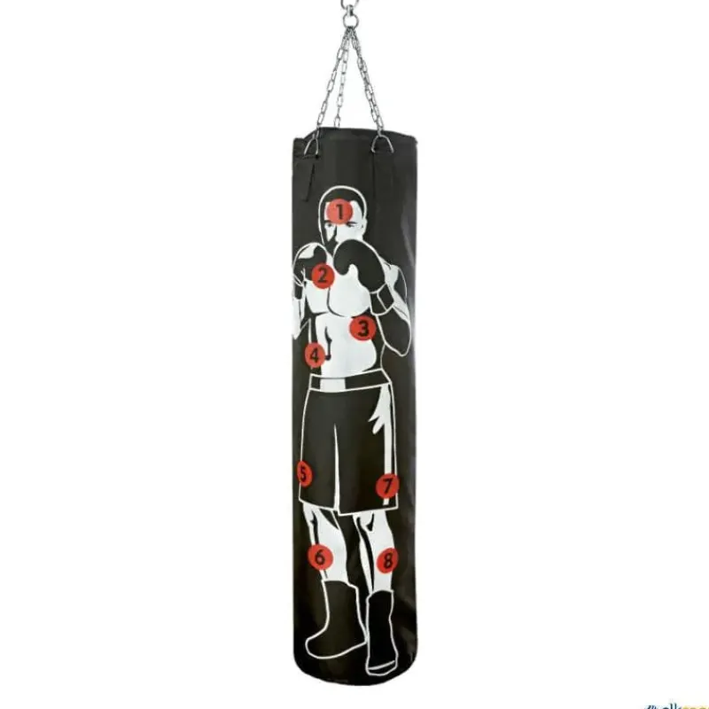Saco de boxeo con silueta y números repartidos por diferentes partes del cuerpo, fabricado en poliéster reforzado con cadenas de suspensión metálicas.