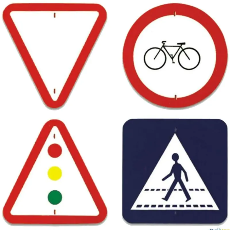 Conjunto de 4 señales de tráfico complementarias para aprenderlas con experiencias divertidas. Se colocan mediante 2 clips de sujeción en las picas, independientemente de su tamaño. A su vez existen diferentes posibilidades (ladrillos, conos, bases) para sostener las picas, por lo que se pueden conseguir circuitos de circulación estables y muy variados.