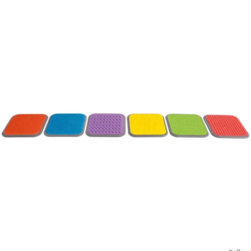 · El conjunto sensaciones plantares básico incluye: 6 placas de plástico con base antideslizante (pincho fino, pincho grueso, línea fina, línea gruesa, agujeros y líneas curvas).