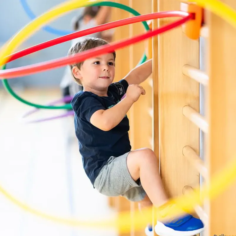 Fija de forma segura tus aros redondos o planos a los travesaños de las espalderas de madera con estos innovadores soportes para aros y empieza a escalar. Anima a los alumnos a trepar y pasar de un obstáculo del aro al otro. Trepar mientras se atraviesan obstáculos enseña a los niños a ser atrevidos y a pensar críticamente. También permite trabajar la coordinación, el equilibrio, la movilidad, la fuerza y la resistencia.