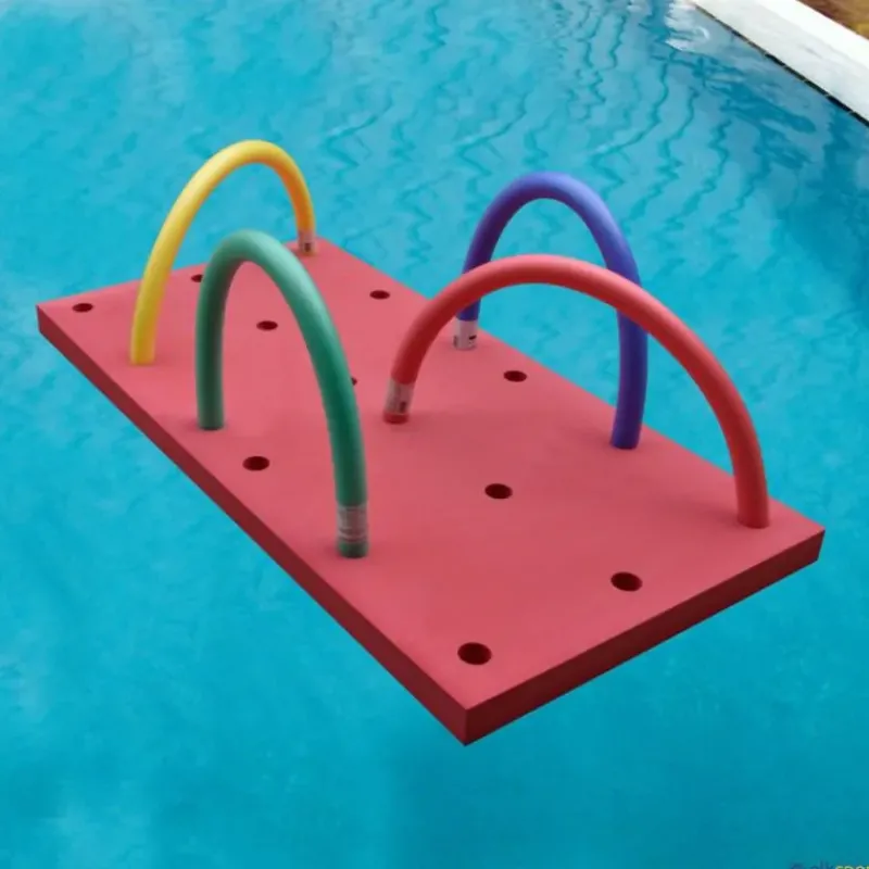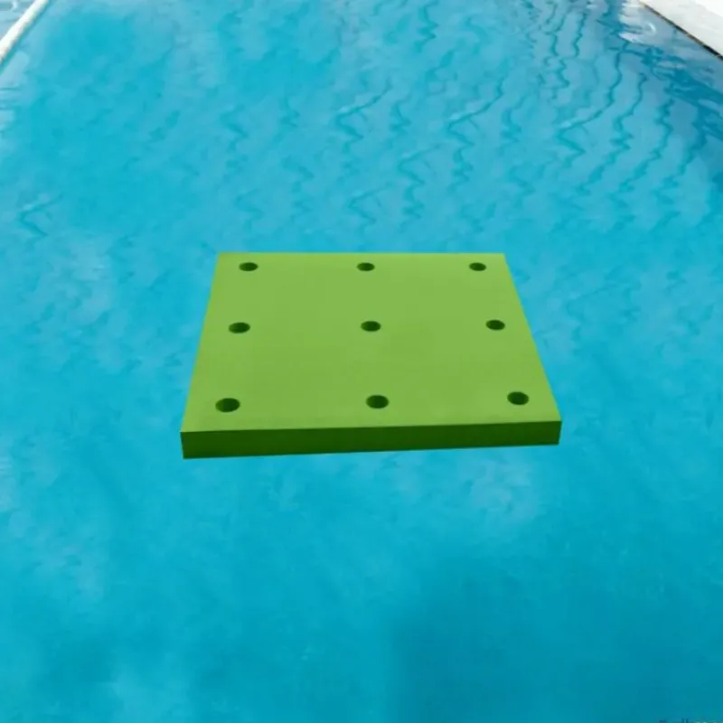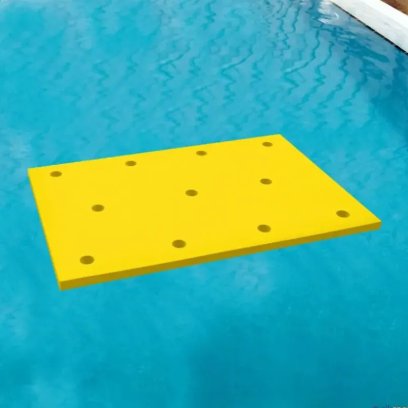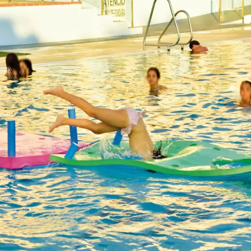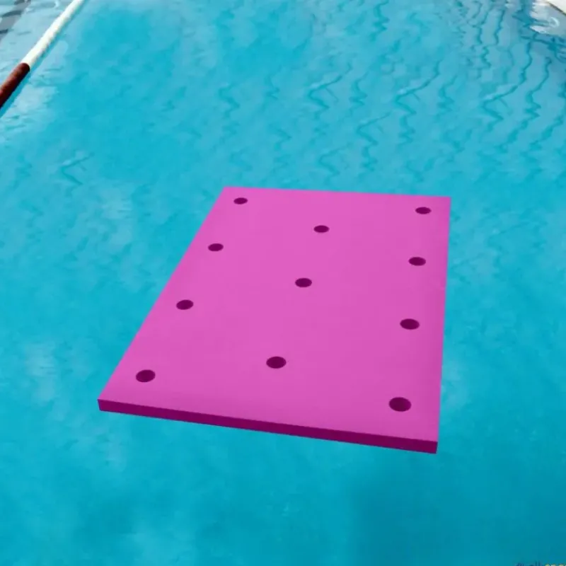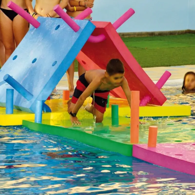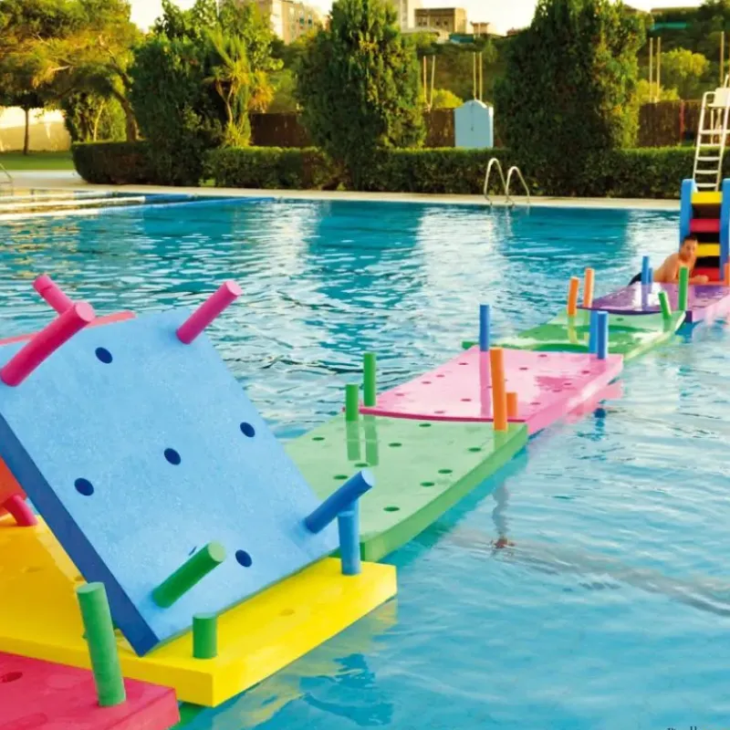 Los tapices de piscina multifunción se pueden combinar entre sí para formar estructuras flotantes, utilizando churros de piscina como elementos de unión entre ellos.
