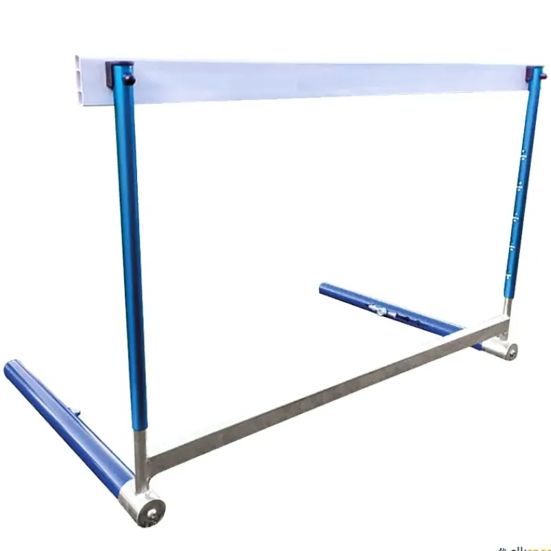 Valla de atletismo de competición y entrenamiento de gran calidad. Parte superior fabricada en tubo redondo de aluminio anodizado en color azul brillante, parte inferior en tubo redondo de acero pintado al polvo en azul vivo. Alturas de fácil ajuste. Listón de valla de plástico.