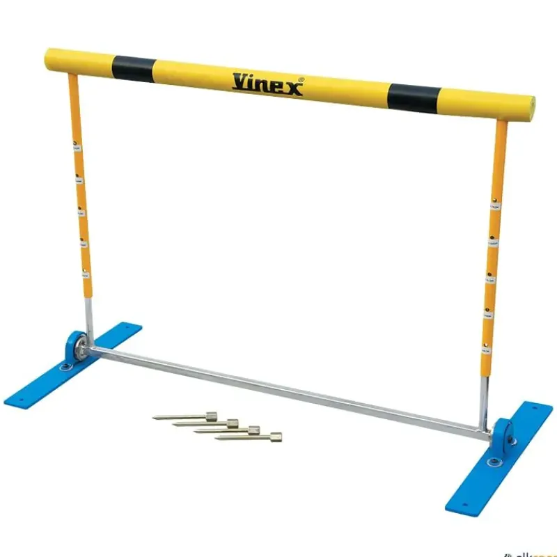 Valla de atletismo fabricada en tubo de acero de 20 mm, pintada al polvo para mayor durabilidad. La parte superior, que se eleva, está fabricada en tubo redondo de aluminio de 22 mm. El mecanismo de resorte de esta valla de atletismo ayuda a que el obstáculo vuelva a su posición cuando el atleta lo derriba. La valla se puede ajustar a diferentes alturas de modo sencillo mediante el método de presión del tetón que sobresale.