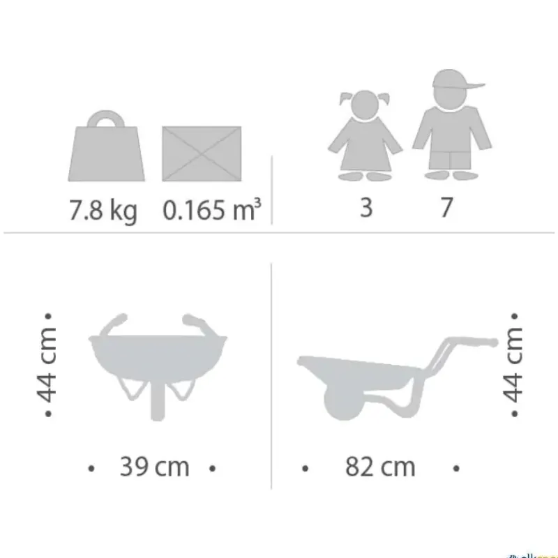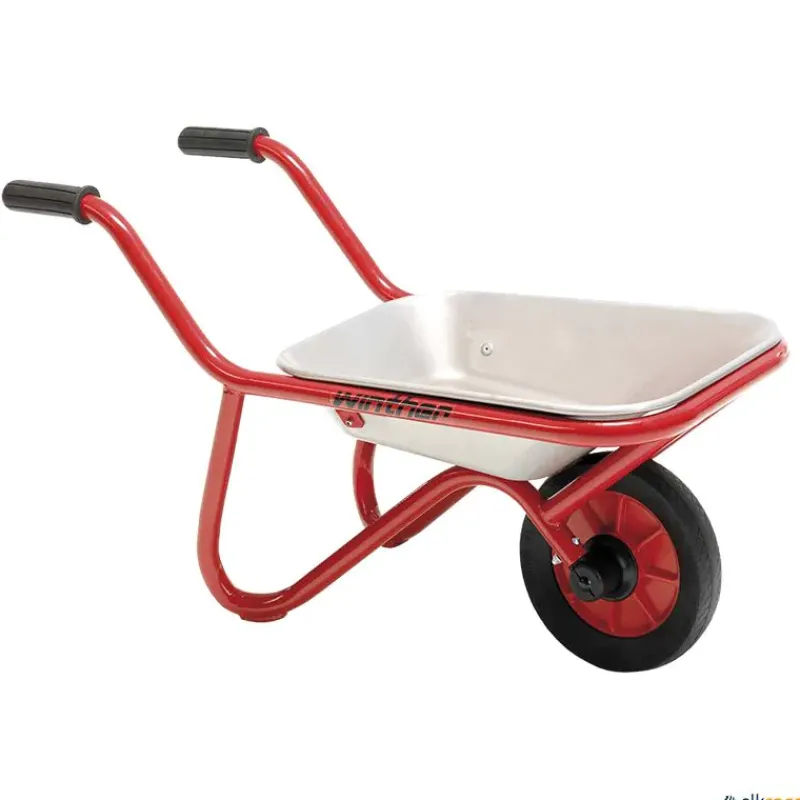 Robusta carretilla para juego infantil de la marca Winther. Cubeta reforzada con el bastidor.