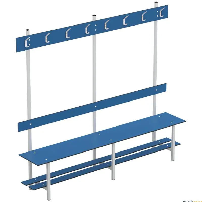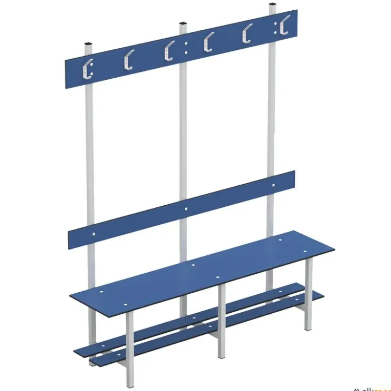 Banco fenólico con zapatero y perchero recomendado para piscinas y vestuarios. Material totalmente antihumedad. Durabilidad y robustez. Estructura soldada en acero inoxidable de tubo de 30 mm. Pintado epoxi. Tacos en PVC antideslizantes.