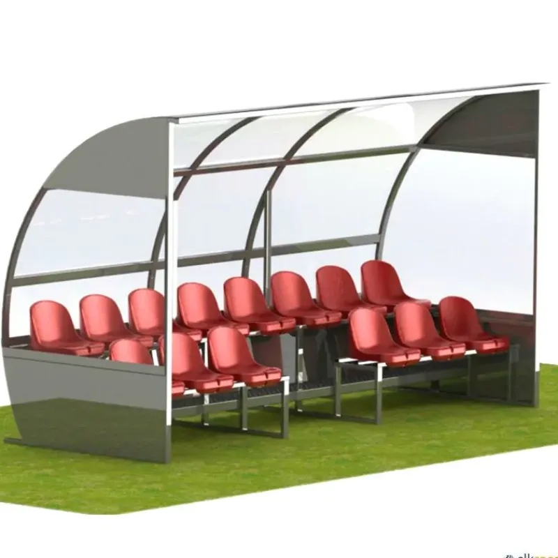 Banquillo construido en perfil de acero galvanizado con parte trasera en policarbonato celular de 6 mm con tratamiento anti UV. Cerramientos laterales en policarbonato compacto de 4 mm. Protecciones antigolpes inferiores realizados en chapa galvanizada. Suelo antideslizante y drenante realizado en chapa galvanizada. Borde superior diseñado para dirigir la lluvia hacia la parte posterior del banquillo. Incluye anclajes para su fijación al suelo.