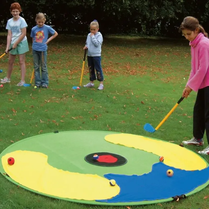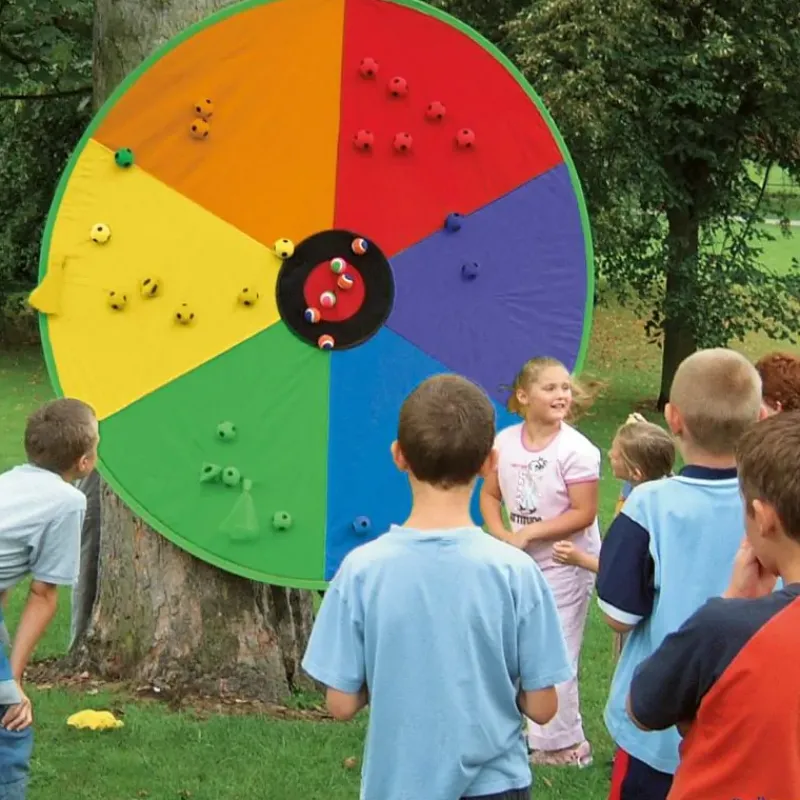 Diana reversible con diferentes juegos en cada cara. Una cara incluye 6 sectores en 6 colores y 2 círculos centrales desplazables. La otra cara simula un ‘green’ de golf con bunkers, agua y agujero central desplazable. Con asas de nailon para colgar, se puede usar plana, elevada, o vertical. Su superficie de velcro permite que se adhieran diferentes objetos en ella. Diana fabricada 100% en poliéster. Con bolsa para almacenar y transportar.