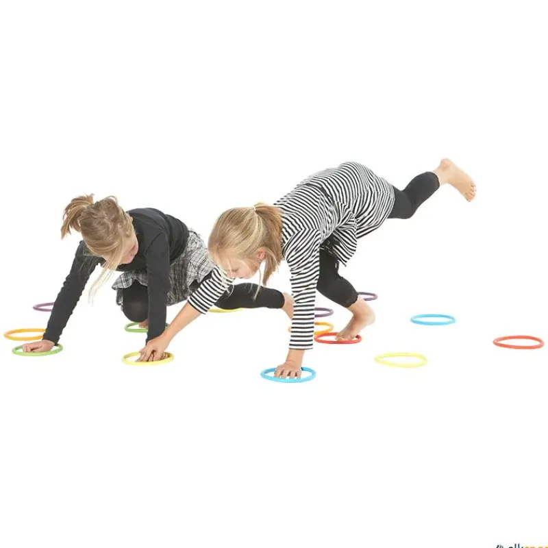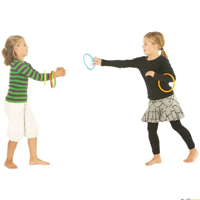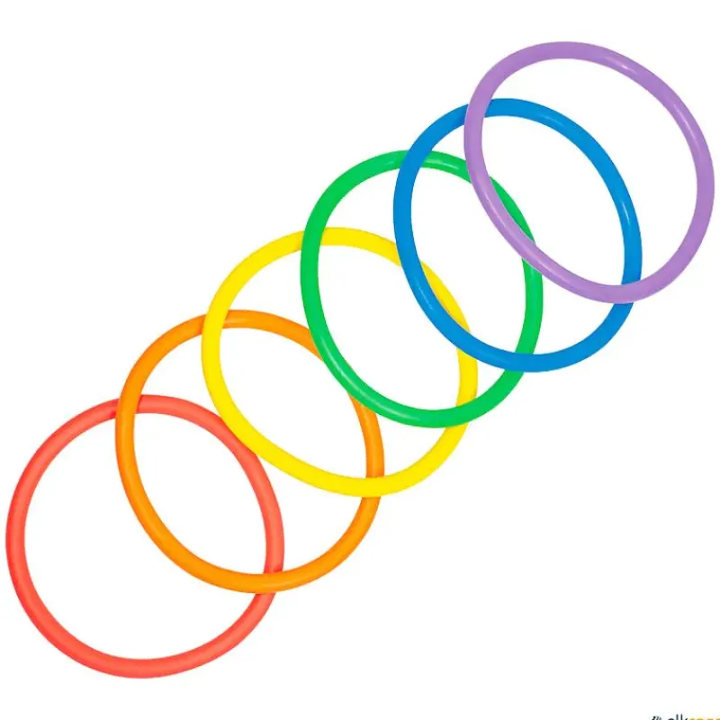 Las anillas de actividad son un conjunto de 6 anillas en 6 colores que atraen a niños de todas las edades, e incluso a adultos. Pueden usarse para infinidad de actividades como bailar en círculo, caminar pisando dentro de ellas con los dedos de los pies, caminar con ellas en la cabeza sin que se caigan, lanzarse anillas unos a otros, crear formas, es vuestra imaginación la que fija los límites.